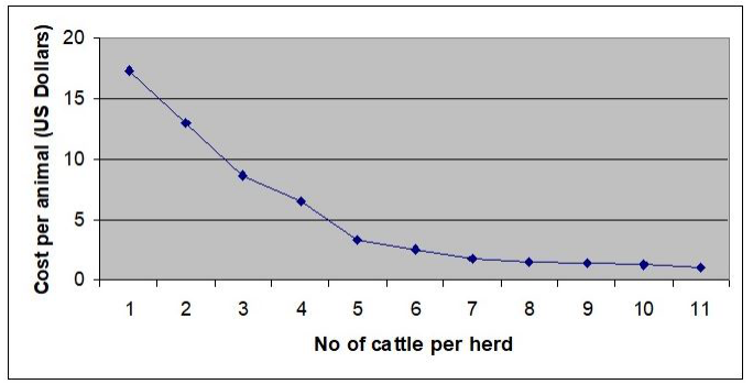 The number of animals immunized per farm had a major influence on the mean cost per animal, with the total cost of immunization decreasing as the number of cattle per herd increased (Figure 2). In this analysis, the cost of monitoring, the professional fees and transportation costs were termed as fixed costs, since they were charged uniformly, irrespective of the number of animals on the farm. These cost contributed 54.9% of the total cost, hence the high cost when few animals were immunised on the farm.