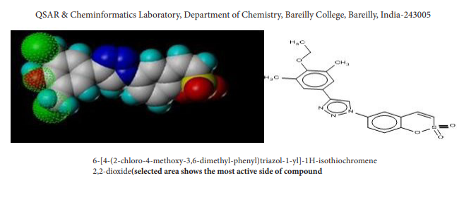 In case the residuals are normally distributed, the data points of the normal probability plot will fall along a straight line through the origin with a slope of 1.0 [40]. Deviations, if any, from this point reflect departure from normal position. Stragglers at either end of the normal probability plot indicate outliers; curvature at both ends of the plot indicates long or short distributional tails, convex or concave curvature indicates a lack of symmetry, and gaps or plateaus or segmentation in the normal probability plot may require a closer examination of the data or model [40]. Figure 3 shows the graph in corroboration of what we have mentioned above. In figure 5, selected area of the compound 4 has been shown, which depicts the active side of compound.