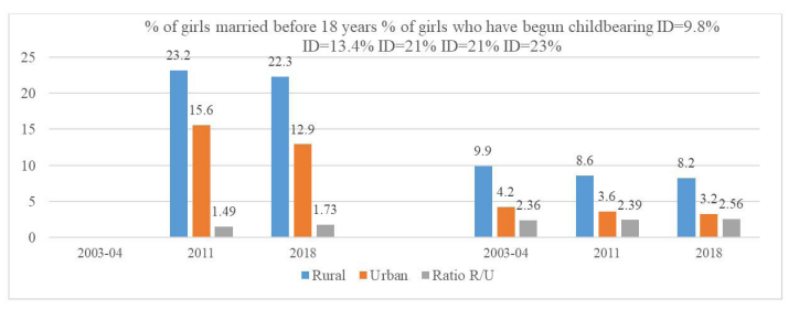 As illustrated by Figure 2 below, the percentages of early marriage and early pregnancy/ motherhood are higher in rural areas than in urban areas. Moreover, the ratios Rural/Urban increased regularly for early marriage (from 1.49 in 2011 to 1.73 in 2018) and for early childbearing (from 2.36 in 2003-2004 to 2.56 in 2018). The iniquity distribution by milieu of residence is confirmed by the high values of the index of dissimilarity which increased from 9.8% in 2011 to 13.4% in 2018 for early marriage and from 21% in 2003-04 to 23% in 2018 for early childbearing.