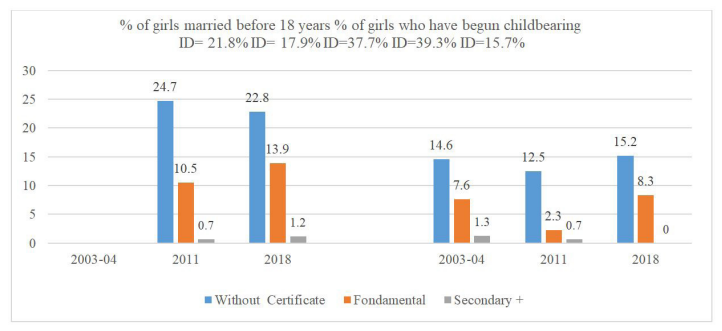 Figure 3: Evolution of the % of Moroccan adolescent girls married before age 18 years and % of adolescent girls who have begun childbearing by level of education |