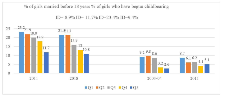 Unfortunately, the PAPFAM survey 2018 does not provide early pregnancy/motherhood by wealth quintile and consequently, comparison is only done using available data from DHS 2003- 04 and PAPFAM 2011 which shows that iniquity was reduced between 2003-04 (ID=23.4% and Ratio Q1/Q5= 3.5) and 2011 (ID=9.4% and Ratio Q1/Q5=1.7).