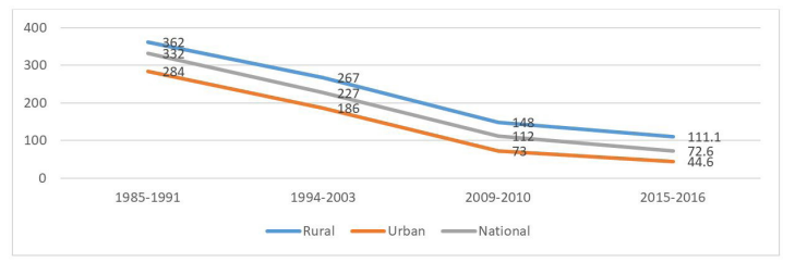Figure 5: Evolution of MMR in rural and urban zones in Morocco during the last 3 decades |