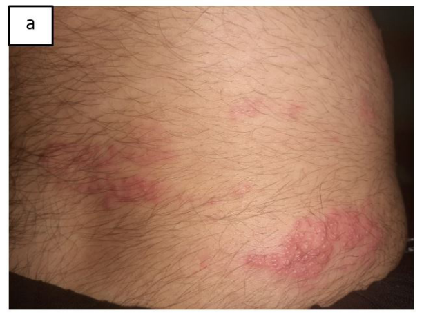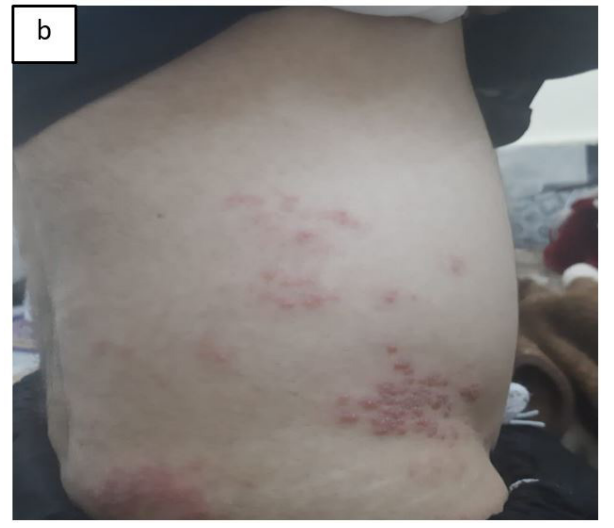 A 28 years old male presented with rashes on the right lower lumbar region associated with burning sensations. According to the patient, he has had chicken pox in his childhood. He also reported that he got his second dose of COVID-19 Moderna vaccine (spikevax-moderna® covid 19) 5 days ago. He has no previous significant medical or surgical history of note. There was no history of any drug use, immunosuppression, malignancy or psychological stress. On physical examination he was vitally stable with temperature of 37.0⁰C, blood pressure of 120/80 mmHg, heart rate of 78/min, respiratory rate 18 breaths/min and oxygen saturation of 98% on room air. On local examination, there are multiple vesicular lesions on right sided L1-L2 dermatome (figure 1: a, b). These lesions were upon an erythematous base. Diagnosis of Shingles was made on classical history and typical physical examination.5
