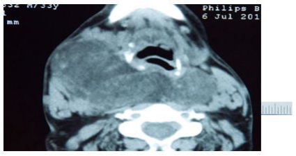Figure 1: A Computed tomography of the neck showing enlargement depending on the thyroid lodge and compressed the trachea |