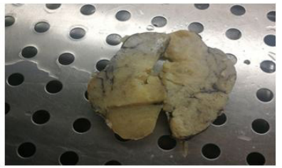 Figure 2:A macroscopically on section of the surgical spicemen, the gland was solid and film in cinsistency, white to tan in color |