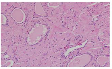 Figure 3: Thyroid amyloidosis: The interstitial tissue is enlarged by abundant amyloid deposit (HE * 400) |