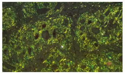 Figure 4: The special Congo red staining showing the yellow-green birefringence of amloid deposits under polarized light (congo red * 400) |