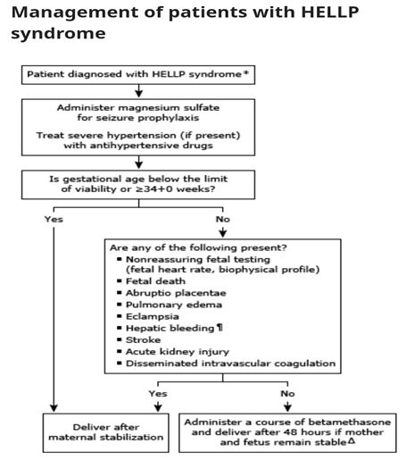 Overall, there are three main treatment options for women with severe preeclampsia and HELLP syndrome viz; 1. Immediate delivery from the 34th week of pregnancy. 2. Delivery within 48 hours after examination, clinical stabilization of the mother and caesarean section. 3. Conservative management for a waiting period greater than 48-72 hours may be considered for pregnant women less than 27 weeks gestation.