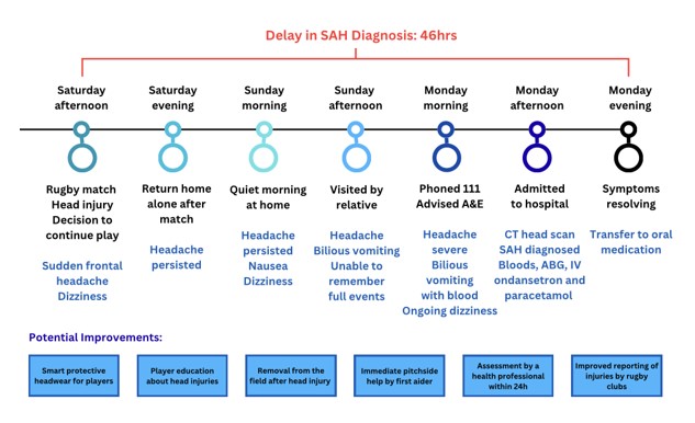 A 25-year old rugby union player sustained a blow to his head from another player’s knee in a legitimate tackle, in a local league match. He experienced a sudden frontal headache without loss of consciousness and was encouraged to continue playing. His symptoms persisted throughout the afternoon and evening, and by the next morning he felt dizzy and nauseous. 24 hours after the match he began vomiting and was unable to recall fully events of the game. He had no photophobia, diplopia, neck stiffness or muscle aches (meningismus). He presented to A&E 46 hours after his injury due to persistent headache and vomiting, as shown in the timeline in Figure 1.