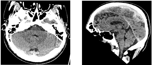 An initial full blood count, serum electrolytes, liver function tests and blood gases were normal. 1g IV paracetamol, ondansetron 4mg IV and NaCl 0.9% was administered via a cannula, with oral codeine 30 mg subsequently once vomiting had subsided. A CT head scan revealed small volume hypertense collection of blood at the left posterior vertex, in keeping with SAH. No mass lesions or midline shift was seen, and there was no evidence of overlying fracture. There was no hydrocephalus or acute infarct, and imaged orbits were normal. Paranasal sinuses and mastoid air cells were aerated with no calvarial fracture.
