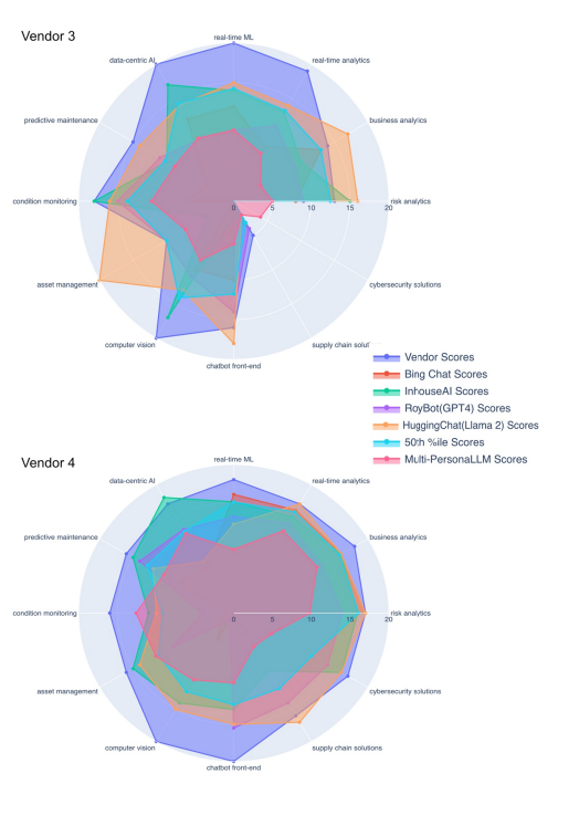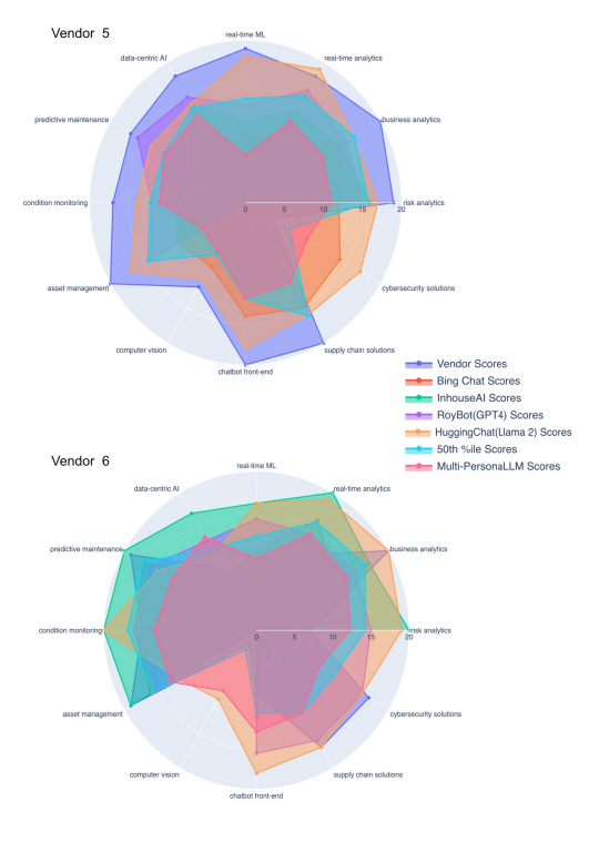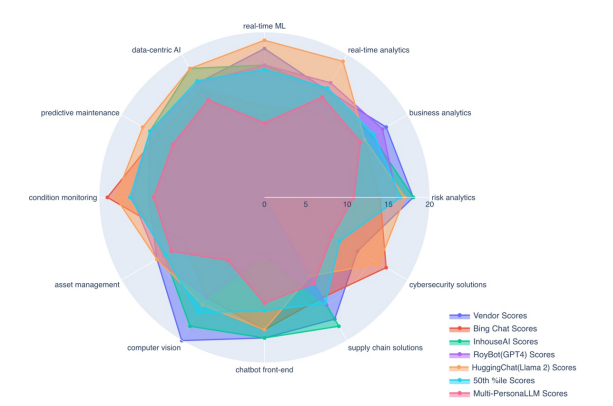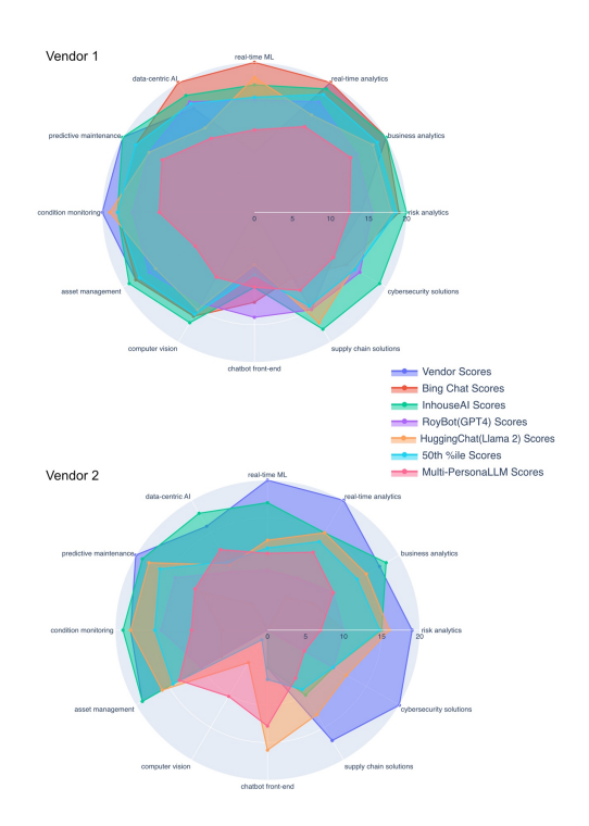 In summary this approach encompassed initial data compilation from vendor websites, followed by an analysis to identify AI subdomains and capabilities relevant to Roy Hill. A set of custom questions evaluated vendors' proficiency in both traditional and generative AI areas. The assessment involved self- -rating surveys completed by vendors, complemented by independent evaluation through various LLMs/LLM products, including GPT4 and Llama 2-70b-chat models, to ensure a broad analysis of vendors' capabilities. The amalgamation of survey results with LLM/LLM product evaluations facilitated a comprehensive review, employing interactive radar plots and statistical interpretation to ascertain optimal vendor partnerships, enhancing transparency and alignment in AI integration efforts.