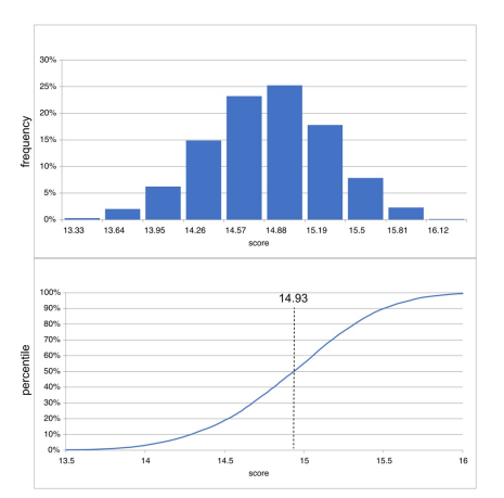 While the histogram in Figure 2 shows the spread of the ratings and frequency of the ratings in each bar, the cumulative distribution function (CDF) holds significance as it portrays the build-up of probability linked to values lower than or equivalent to a designated threshold [28]. It is a cumulative because it sums the total likelihood up to a given threshold. In Figure 2 we can see the dotted vertical line that is showing the 50th percentile at 14.93, which means that the 50th percentile is less than or equal to 14.93. Therefore, the histogram is more useful for seeing the shape and spread of the data, while the CDF is more useful for seeing the percentiles and ratings.