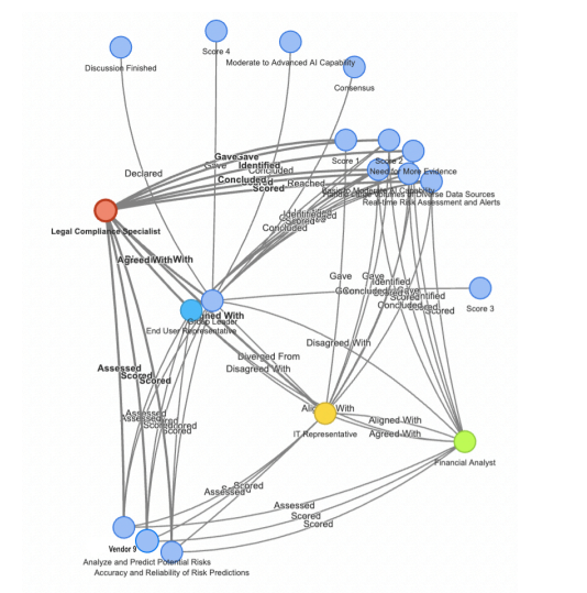 Figure 3 exhibits a sample knowledge graph stemming from vendor 9 risk analytics assessment performed utilizing MPLLM. By analysing the knowledge graphs yielded from MPLLM vendor assessments, we aim to illuminate the intricate problem-solving process governing the model's conclusions and spotlight any nuanced disparities across distinct persona deployments. Ultimately, developing a centralized knowledge base will allow us to draw upon previously encountered challenges and resolutions, fostering consistent improvement in performance, transparency, and credibility across diverse applications. Continued expansion of this evolving line of inquiry will offer promise for future developments in MP-LLM implementations, contributing to more efficacy and generalizability.