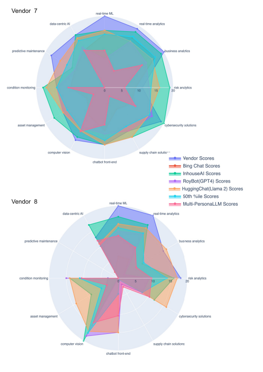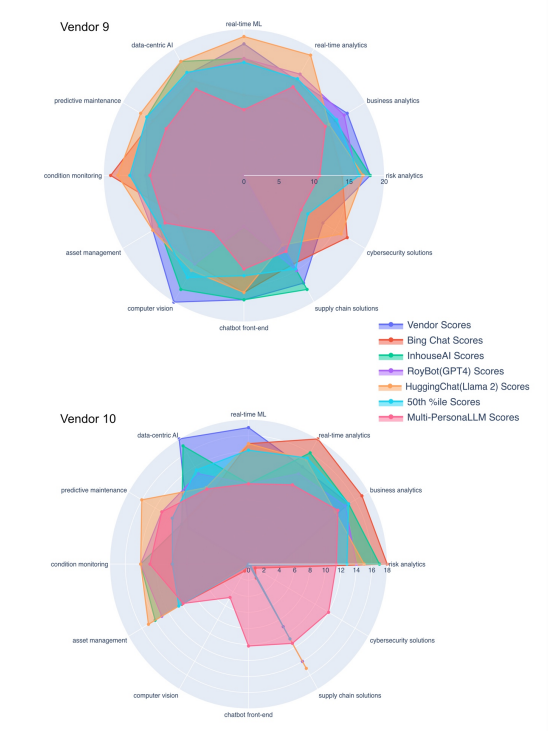 For each vendor's AI capabilities assessment, superimposed radar plots were generated and stored in HTML format to enable interactive analysis. This format supports dynamic interaction, allowing users to alternatively display or conceal individual radar plots from seven distinct evaluations, including vendor surveys, assessments from four different LLMs/LLM products, median outcomes from Monte Carlo simulations, and MP-LLM evaluations. Across these assessments, twelve crucial AI areas such as Risk Analytics and Cybersecurity Solutions were visualized, facilitating direct comparison through this interactive medium. Each segment within the radar plots represented a distinct assessment, with the area covered reflecting the score or capacity level in a specific AI domain. For instance, a static visualization for one particular vendor, referred to as vendor 9, demonstrates the comparative analysis of these seven assessments (See Figure 1 and Appendix A for illustrations of all the vendors). The analysis revealed that MP-LLM assessments provided a more cautious viewpoint by accounting for aspects otherwise overlooked in the survey outcomes and LLM/LLM product scores. The differences between the assessments from the LLMs/LLM products and MP-LLM suggests the significance of human judgment in interpreting these results, despite the reduced operational speed by the MP-LLM model.