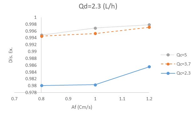 The tests were carried out in different operating conditions and will be accompanied by mass transfer. The tests were carried out in the range of optimal operating conditions, scattered phase flow intensity (1.5, 2.3, 3.7) liters per hour, continuous phase flow intensity (2.3, 3.7, 5) liters per hour and impact intensity (0.8, 1, 1.2) cm/s were performed. In this way, 27 tests were performed below the overflow point. In fact, these values of the operational parameters used were chosen in such a way that the tests were performed below the overflow point. Analysis was used to check dysprosium concentration after extraction.