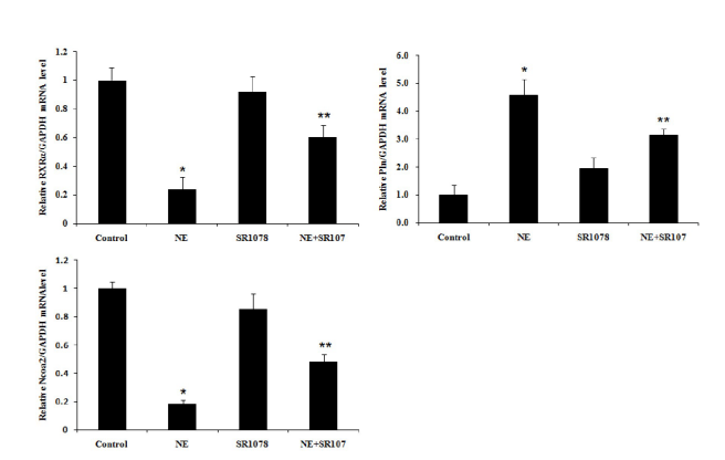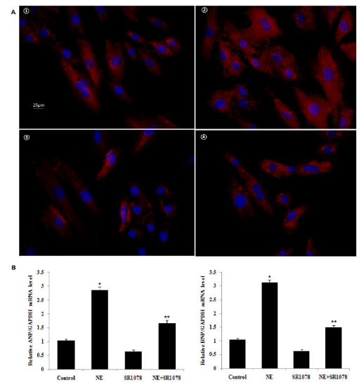 As shown in Figure1, the size of NRVMs was enlarged and mRNA levels of ANP and BNP were increased by norepinephrine compared with control group. However, cotreatment of SR1078 and norepinephrine decreased the size of NRVMs, ANP and BNP mRNA expression levels.