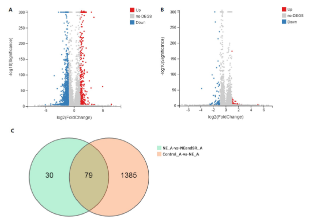 There were 1464 differentially expressed genes with fold change ≥2 and FDR<0.001 between the Control group and NE group, among which 443 genes were upregulated and 1021 genes were downregulated. There were 109 differentially expressed genes between NE group and NE+SR group with fold change ≥2 and FDR<0.001, among which 49 genes were upregulated and 60 were downregulated. In Figure2A and 2B, the volcano plot was applied to demonstrate an overview of differentially expressed genes. As shown in Figure 2C, the venn diagram demonstrated that there were 79 differentially expressed genes between control vs. NE group and NE vs. NE+SR group.