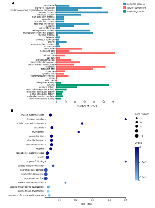 The functional classifications of the 79 differentially expressed genes were demonstrated by GO analysis. GO terms involving cellular components, biological processes, and molecular functions were presented in Figure 3A. The column is longer, the GO term is more significant difference. The top 20 most enriched GO terms were shown in Figure3B. The size of the dots represented the number of mapped genes. The rich factor represented the degree of enrichment. As the rich factor is larger, the degree of enrichment is greater. The q-value is closer to 0, the enrichment is more significant.