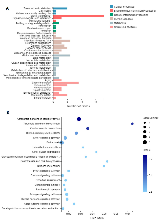 KEGG pathway enrichment was utilized to analyze the 79 differentially expressed genes in the associated signaling pathways. KEGG terms involving cellular processes, environmental information processing, genetic information processing, human disease, metabolism, organismal systems were shown in Figure 4A. As the column is longer, the KEGG term is more significant difference. The top 20 enriched pathways were shown in Figure 4B, including thyroid hormone signaling, a crucial pathway in cardiac hypertrophy.