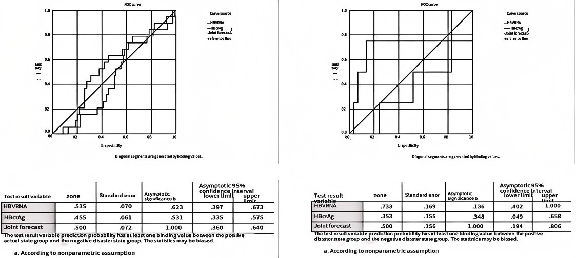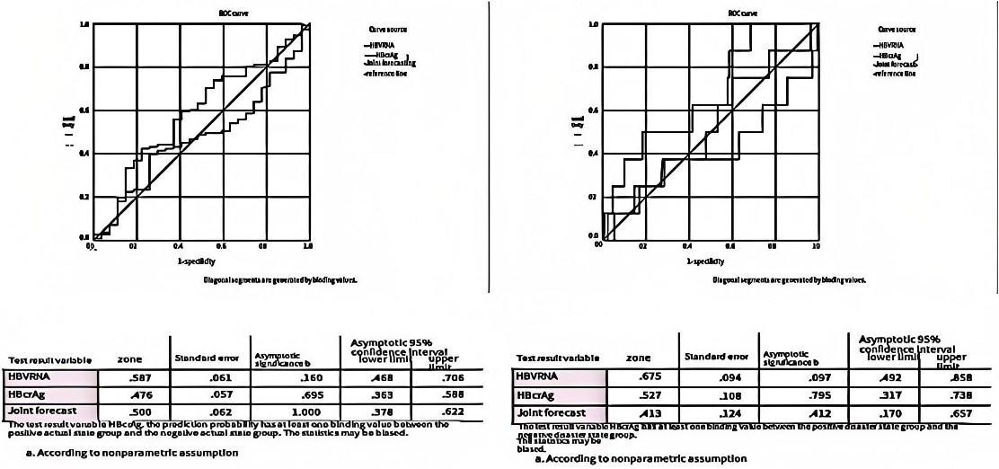 Under the ROC curve of the mild, moderate and severe liver fibrosis was 0.500,0.500, and 0.675, respectively, and the ROC curve of the mild, moderate and severe liver fibrosis was 0.587,0.500, and 0.869, respectively. Among them, the average area under the curve of mild and moderate liver fibrosis under e-antigen negative was around 0.5, Represents meaningless; The average area under the curve of mild liver fibrosis and moderate liver fibrosis under e antigen was around 0.5, It means meaningless, In which, the area under the curve of severe liver fibrosis was 0.869, Serum HBV RNA alone predicted the area under the ROC curve of 0.857, The combined prediction of both patients can improve the diagnostic efficiency; Further analysis of the optimal cut-off value, To ved that when the HBV RNA critical value is greater than 5011.73, It has a sensitivity of 1, The specificity was 0.75, When the HBcrAg critical value is greater than 0.5664, With a sensitivity of 0.333, The specificity is 1.