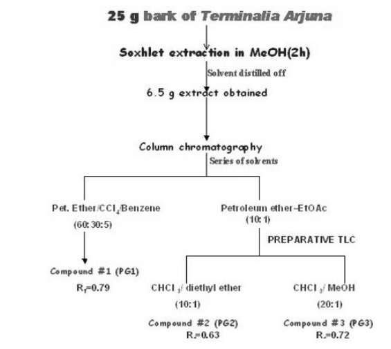 In view of importance of phytoconstituents in natural herbs used as medicines, we have isolated three organic phytoconstituents in methanolic extract of T arjuna and identified these by elemental analysis, infrared (ir) spectra, proton magnetic resonance (NMR) spectroscopy and gas chromatography-mass spectrometry (GC-MS).