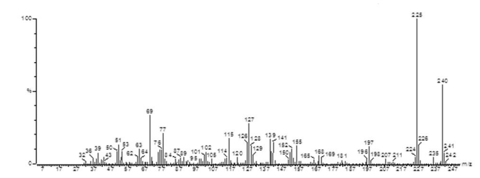 MS at Rt = 9.58 min, m/z (relative intensity) is shown in Fig 3. M+ 240 (59.3%, C15H12O3), 225 (100%, +C14H9O3), 197 (16.2%, +C12H5O3), 77 (24.1%, +C6H5), 69 (34.6%, +C4H5O)
