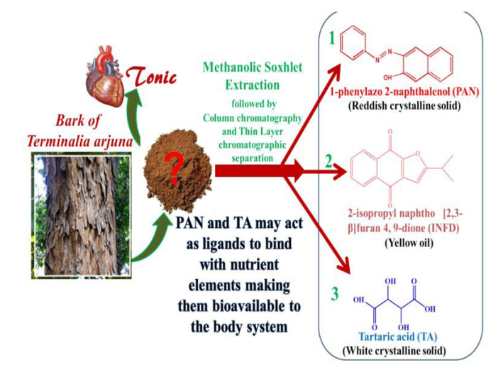 Arjun (Terminalia arjuna) bark powder is one of the most extensively used herbal tonic for cardiovascular disorders, high blood pressure, cancer, wound healing and other chronic diseases. Its Soxhlet extraction with methanol was subjected to column chromatography followed by thin layer chromatography whence three new phytoconstituents were separated. These were identified by C, H and N analysis, ir and NMR spectroscopic studies and finally by GC-MS fragmentation patterns. The compounds isolated were 1-phenylazo 2-naphthalenol (PAN), 2 - i s o pro py l naphtha [2, 3-β] furan- 4, 9-dione (INFD) and tartaric acid (TA). It is proposed that PAN and TA, having bidentate sites may act as ligands to bind with nutrient elements such as Mn, Fe, Cu, Zn to form chelates thus making them bioavailable to the body system.
