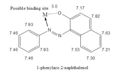 These assignments match well with the possible structure of the compound 1-phenylazo 2- naphthalenol (PAN) with two binding sites, a coordinate bond through N and a covalent bond through O to form a six membered ring with transition metal ions. Its structure with two possible binding sites is shown below