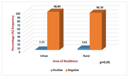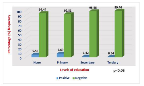 The mean age of the pregnant women was 30.9 years (standard deviation [SD]-6.1; range: 18-48 years) (Table 1). Majority of the participants totaling 212 (47.96%) had completed secondary education while 186 (42.08%) others had tertiary education. A major percentage of the subjects 359 (81.22%) resided in urban areas of Lagos state while only a few 83 (18.78%) resided in rural areas. At the point of enrolment, 34 (7.96%) of them had fever while 408 (92.31%) were without fever. Over a third (39.14%) of the pregnant women were multigravidae (n=173), 156 (35.29%) were secundigravidae while 113 (25.57%) were primigravidae. As for parity status, 236 (53.39%) of the pregnant women were multiparous while 206 (46.61%) were primiparous. A total of 142 (32.13%) were in first trimester, 186 (42.08%) were in second trimester while 114 (25.79%) were in third trimester. Age group 31-35 recorded highest prevalence (2.04%) of Zika virus antibodies while the lowest rate (1.28%) found among age group ≤25 years with no significance difference (P>0.05; X2 =0.3132) between Zika virus infection and age groups. Highest prevalence (7.69%) of zika virus antibodies was among pregnant women who had only primary education while those with secondary and tertiary education had the least prevalences of 1.42% and 0.54% respectively (Figures 1-3). There was a significance difference in the prevalence of zika virus antibodies in relation to level of education (P< 0.05; X2=9.391).