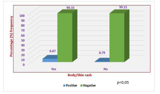 This indicate that 382 (86.43%) did not show any evidence of body rash, 386 (87.33%) subjects had joint/muscle pain while most of the subjects 434 (98.19%) had no conjunctivitis. Also, 346 (78.28%) them had edema of extremities, 41 (9.28%) had moderate and mild anaemia while 401 (90.72%) were not anaemic (Table 3). Prevalence of zika virus antibodies was significantly higher (8.82%) in pregnant women with reported fever at the point of enrolment when compared with women without fever (P< 0.05). Similarly, pregnant women with anaemia had significantly higher prevalence of zika virus antibodies (9.76%) when compared with women without anaemia (p< 0.05). In relation to body/skin rash, the prevalence of zika virus antibodies was significantly higher among pregnant women with reported cases of skin/body rash when compared with pregnant women without body rash (p< 0.05). Pregnant women with body/skin rash recorded a prevalence of 6.67% for zika virus antibodies while those without body rash recorded a prevalence of 0.79%. Prevalence of zika virus antibodies was significantly associated with conjunctivitis (p< 0.05). The prevalence of zika virus antibodies was significantly higher among pregnant with conjunctivitis when compared with those without conjunctivitis (p< 0.05). Pregnant women with joint/muscle pain recorded a prevalence of 5.36% for zika virus antibodies while those without joint/muscle had a prevalence of 1.04%. Pregnant women using ITNs had a reduced prevalence of 0.38% for zika virus antibodies while those who were not using ITNs had a higher prevalence rate of 3.39% for zika virus antibodies but no statistical association (p>0.05). Pregnant women with edema of lower extremities had significantly higher prevalence (4.17%) of zika virus antibodies when compared to women without edema of lower extremities (p< 0.05) (Table 3, Figures 4-8).