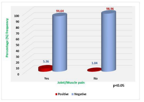 Suggest clinical features of zika virus infection ranged from joint/muscle pain seen in 5.36% (95%CI=1.31–19.96; p=0.0466) in Lagos ante-natal clinic from Joint/Muscle pain presentation (Ambry et al., 2017) of cases to conjunctivitis (25%) OR=28.06; 95%CI =5.046–77.52; p=0.0058) among those with conjunctivitis and this could be due to several reasons. A major possibility is that differences in definitions of symptoms and criteria for Zika virus infection (including the diagnostic test used) could have led to differences in prevalence estimates when compared with Zika endemic regions of the world in which the participants presented with clearly defined symptoms corresponding to higher rates of infection [8,30,31]. This possibility is supported by the lower prevalence of asymptomatic Zika virus infection in pregnant women with confirmed recent infection than in those with possible recent infection of 42% against 63% in a previous study in the United States [32]. Furthermore, in this study, commonly reported symptoms of Zika virus infection documented were fever, muscle pain, joint pain and conjunctivitis. This suggests symptomatic infection among the pregnant women thus confirming the possibility of presumptive diagnosis. In a previous study in the US, prevalence rates of Zika virus infection using presumptive diagnosis was 63% compared with a prevalence of 42% using molecular diagnosis. Patients presenting with clinical features of joint/muscle pain and conjunctivitis could therefore be further evaluated for Zika virus infection using laboratory diagnostic measures. Consequently, conjunctivitis appears statistically significant to be the commonest feature of Zika virus infection with 25% of pregnant women presenting with the symptoms.