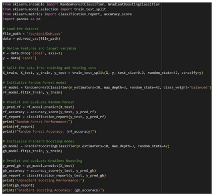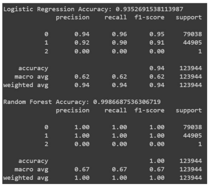For the DDoS dataset, we deployed, implemented, and fully integrated two machine learning models, following extensive data preprocessing to cleanse the dataset and eliminate potential errors. The two machine learning classifiers chosen for this task are Random Forest and Logistic Regression, each offering unique advantages in identifying DDoS attacks: