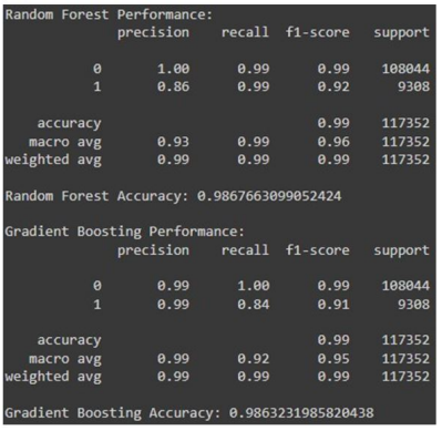 ● Gradient Boosting: Sequentially builds trees to correct previous errors, achieving high precision and recall for distinguishing between benign and malicious traffic.