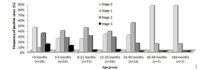 Among children hospitalized for gastroenteritis (n = 238), the correlation between the dehydration stage (stage 1: < 5%: mild dehydration, stage 2: 5-10%: moderate dehydration, stage 3:> 10 %: severe dehydration, vital risk) and age of children was studied (Figure 1). Statistical analysis showed a significant difference (P = 0.035), indeed age was inversely correlated with the stage of dehydration. The youngest children (age < 3 months) were the most dehydrated and stage 3 of dehydration has been detected only in children under 24 months.