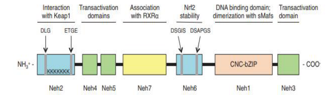 Figure 1: human Nrf2 protein structure. The Nrf2 protein is made up of seven Neh domains. The Neh1 CNC-bZIP domain is in charge of DNA binding and dimerization with small Maf proteins; the Neh2 domain mediates interaction with Keap1 via the DLG and ETGE motifs and contains seven lysine residues that are ubiquitylated; the Neh3, Neh4, and Neh5 domains are transactivation domains; the Neh6 domain is a serine-rich region that regulates Nrf2 stability; and the Neh7 domain bZIP, basic-region leucine zipper; CNC, cap ‘‘n" collar; Keap1, Kelch-like ECHassociated protein 1; Neh, Nrf2-ECH homology; Nrf2, nuclear factor E2-related factor 2; RXRa [4]. |