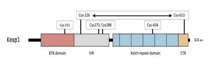 Figure 2:The domains of Keap1 are displayed in their current locations. The Bric-a`-Brac (BTB) domain (shown as a striped red box) is responsible for the formation of Keap1 homodimers and the recruitment of Cullin-3, whereas the Kelch-repeat domain (each Kelch domain is depicted as a blue box) and the C-terminal region (CTR, depicted in light orange) form a six-bladed β-propeller structure that binds the DLG and ETGE motifs in Nrf2. The intervening region (IVR), which wraps around the β-propeller structure, is made up of residues between the BTB and Kelch-repeat domains. Residues that function as sensors for electrophiles and H2O2 (i.e., Cys-151, Cys-226/Cys-613, Cys-273/Cys-288, and Cys-434) are shown in open boxes above the cartoon, and the horizontal two-headed arrow between Cys-226 and Cys-613 signifies that they form a disulfide bridge when exposed to H2O2 [10]. |