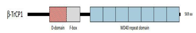 Figure 3:The domain locations in b-TrCP1 are shown. A striped red box represents the dimerization domain (D domain), which produces homo- and heterodimers between b-TrCP1 and b-TrCP2, and a grey box represents the F-box, which recruits Skp1 (S-Phase Kinase-Associated Protein 1). Finally, the blue boxes indicate the WD40 repeat domain, which binds the DSGIS and DSAPGS motifs in Nrf2 [10]. |