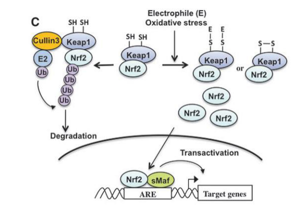 Figure 4: The mechanism of Nrf2 activation is depicted in this diagram. Nrf2 is constitutively ubiquitinated by the Keap1=Cullin3 ubiquitin ligase complex in non-stressed circumstances. Keap1 is inactivated and changed at its regulatory cysteine residues when exposed to electrophile (E) or oxidative stress. Inactivation of Keap1 promotes nuclear accumulation of Nrf2 and ARE-dependent transcription. [15]. |