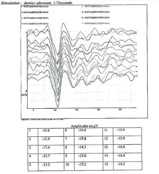A visual habituation test was performed on a single stimulation angle, either 32 or 64 squares choosing the largest starting amplitude, by 15 trains of 30 stimulations. The normality criterion used was that of the literature (Schoenen and PYL article), i.e. a 30% drop in response amplitude between the1st and 15th stimulation. The examination of visual habituation was deemed pathological when a recording of stability, an increase or a fall < 30% in amplitude between the1st and 15th stimulation concomitantly with the same amplitude progression between stimulation train 1 and 5 over the 3 successive blocks of 30 stimulations.