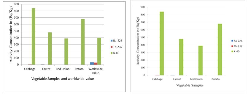 In the rest vegetable samples (Cabbage, Red Onion and Potato) no measured activity concentration of 226Ra was found and in vegetable samples (Carrot, Red Onion and Potato) no activity concentration of 232Th also was found, their values were below minimum detectable limit. In the present study, the measured activity concentrations of 226Ra and 232Th in all vegetable samples are lower than the worldwide values 35 Bq/Kg and 30 Bq/Kg respectively [23-24].