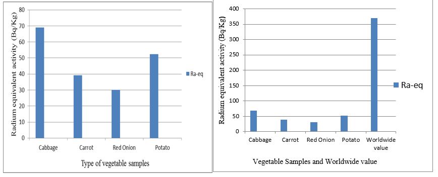 Radium Equivalent Activity (Raeq) calculated using Eq. 3. The Raeq for Cabbage, Carrot, Red Onion and Potato samples were 68.94 Bq/kg, 39.09 Bq/kg, 30.03 Bq/kg and 52.36 Bq/kg respectively. As shown in Table 4 and Bar graph in Figure 4 the maximum calculated value of Raeq was 68.94 Bq/Kg in the Cabbage sample, while the minimum calculated value of Raeq was 30.03 Bq/Kg in Red Onion sample. These values are far below the allowable limit (370 Bq/kg) (Figure 4) recommended by the International Atomic Energy Agency [23].