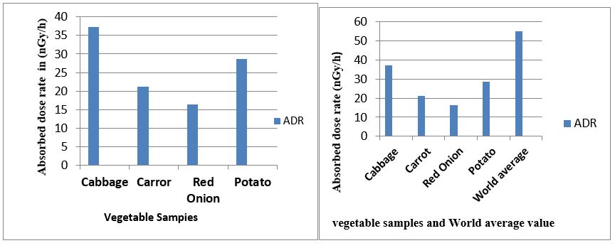 [The absorbed dose rate, ADR (nGy h - 1) depends on the activity concentrations of 226Ra, 232Th and 40K natural radioisotopes. The absorbed dose rate was calculated using (Eq.2) on the basis of the UNSCEAR (2000) guideline and is given in Table 4. In the present study, the dose rate due to 226Ra, 232Th and 40K in Cabbage, Carrot, Red Onion and Potato samples are 37.28 nGyh-1, 21.16 nGyh-1, 16.38 nGyh-1 and 28.56 nGyh-1, respectively. As shown in Figure 5 the maximum absorbed dose rates were observed in Cabbage sample, while the minimum absorbed dose rates were obtained in Red Onion sample. The obtained values in all samples are below the world average of 55 nGyh–1 (Figure 5) [25].