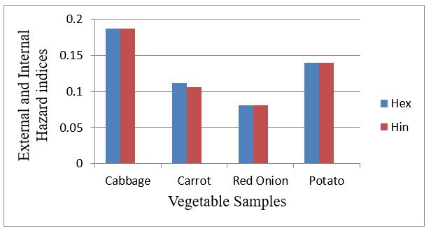 As shown in Table 4, the highest calculated external hazard index was 0.187 in the Cabbage sample, while the lowest external hazard index was 0.081 in Red Onion sample. In our study, the vegetable samples Hin values were 0.187, 0.106, 0.081 and 0.14 for Cabbage, Carrot, Red Onion and Potato respectively. As shown in Figure 6, the internal hazard indices (Hin) in Cabbage were greater than Potato, Hin in Potato was greater than Carrot, and Hin in Carrot was greater than Red Onion. Therefore, the highest and the lowest internal hazard indices (Hin) were calculated in Cabbage and Potato respectively. The calculated Hex and Hin values for all vegetable samples should be below unity, which does not cause harm to the populations of the investigated region in Akaki Kality, Addis Ababa, Ethiopia.