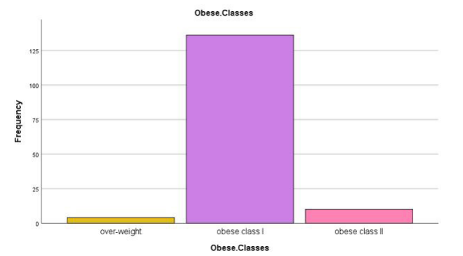 Obese class 1 is the main obesity found in our study 136 (90.7%) while other classes of obesity have low prevalence (Table 1 and Figure 4).