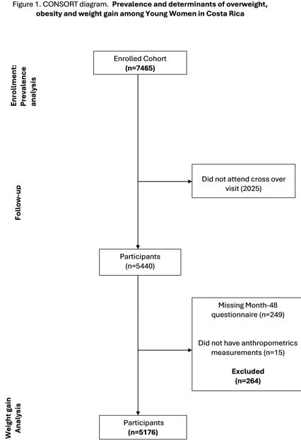 Methods: We analyzed data from 7,465 women aged 18–25 in the Costa Rica HPV Vaccine Trial. Body Mass Index (BMI) classified overweight (25–29.9) and obesity (≥30). Prevalence was assessed among the same women at baseline (2004/2005) and follow-up (2010/2011). Logistic regression identified determinants of overweight/obesity and ≥20% weight gain.