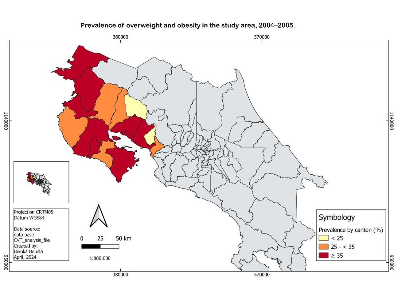 We also observed geographic differences in overweight and obesity, with higher prevalence in coastal regions (e.g., Puntarenas, La Cruz) and lower prevalence in mountainous regions (e.g., Montes de Oro, Tilarán). These differences were not explained by the variables included in our models and may relate to population composition or regional environmental factors, as previously described in Costa Rican studies [46–49].
