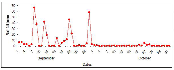 Unfortunately, during the experimental year, the rainy season finished in the month of September. So, there was little rainfall in the month of October (Figure 1). About 70 mm rainfall was recorded at first week of September and similar amounts of rainfall were also recorded at the end of this month.