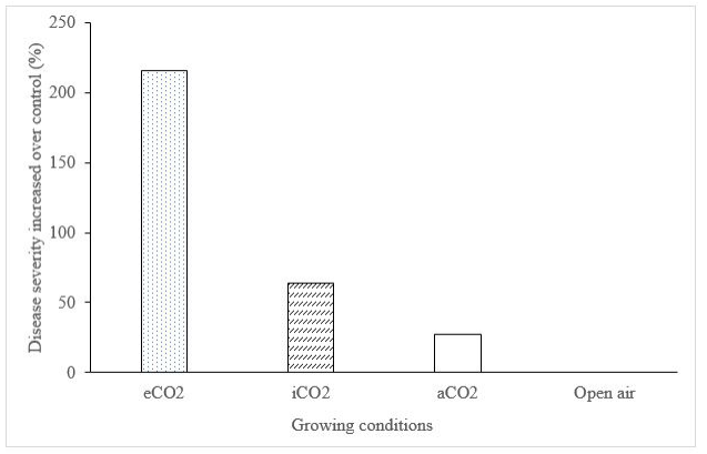 With eCO2 condition, the sheath blight disease severity was increased by 216% over control (open air) treatment. But severities were 64% and 27% with iCO2 and aCO2, respectively (Figure 2). The CO2 is one of the most important factors for influencing the host and pathogen growth and development. It has a positive correlation among CO2, plant and pathogen. When the level of CO2 raises the growth and development of pathogen accelerated. In the meantime, plant physiology and structure for instance quantity of nutrients and canopy become changing more rapidly. Higher level of CO2 concentration increases temperature level and diminish the quantity of silicon in rice plant. As a result, plant become more susceptible and enhance disease infestation (Kobayashi et al., 2006) [16,18].