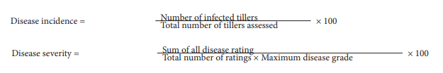 Each pot was visited regularly for recording plant diseases and their incidence and severity. The disease incidence and severity were recorded till maturity stage of rice. Data were recorded visually by observing the prominent symptoms and confirmed the disease and their causal organism through in vitro assessment. The number of tillers hill-1 and number of diseased tillers hill-1 were considered for data collection. Disease severity was estimated according to the Table 1. Finally, the disease incidence and severity were calculated by the following formula (Rajput and Bartaria, 1995):