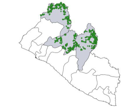 Our research used data from Bong, Lofa, and Nimba counties, as well as a multistage random sampling technique. Out of the ten (LCAs) producing cocoa areas in the country, we purposefully selected three local cocoa areas (LCAs) at random from the cocoa region known for high cocoa production. A structured questionnaire was used to collect the data. The information gathered includes the respondents' socioeconomic characteristics, their level of awareness of cocoa rehabilitation techniques, extension visits, and their level of adoption of cocoa rehabilitation techniques, among other things. The number of strategies that the farmers were aware of after adoption was divided into low, medium, and high adoption levels to determine the level of understanding and adoption. Adoption of no more than two techniques was deemed insufficient; three to four techniques were deemed medium; and more than five techniques were deemed high [3]. Figure 1 shows the locations of the cocoa farms those enumerators who work for the Central Agricultural Research Institute visit.